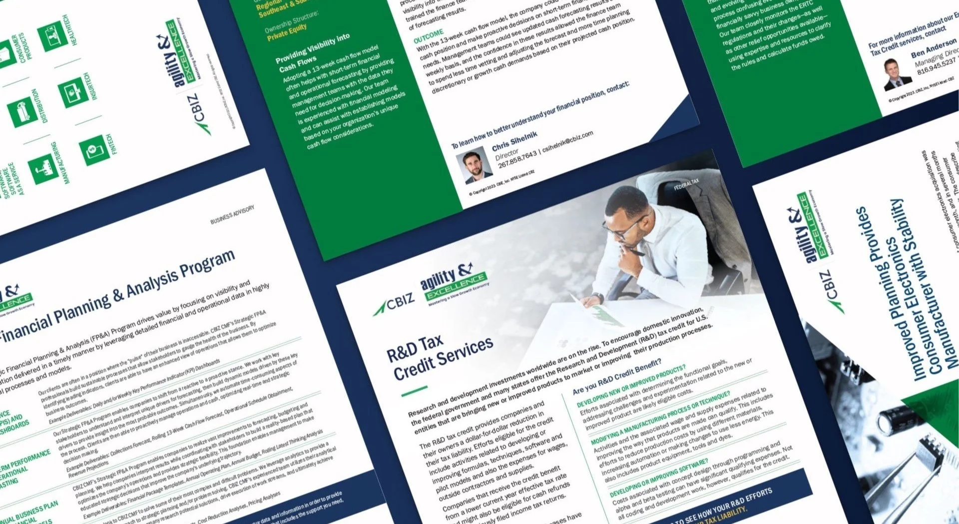 With the potential recession on the horizon, many mid to large size companies are panicking. CBIZ Financial Services responded by crafted the campaign, Agility & Excellence. This campaign offers materials of dedicated solutions for clients to master the slow economic downturn. Agility & Excellence’s thematic focus is to provide insight of agile development needed, for a successful, dare I say excellent, end goal of profiting during times of uncertainty.